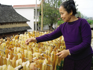 傣族老阿媽出售半生半熟的泡牛皮