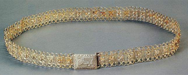 傣族銀腰帶傣族婦女喜歡帶手鐲、戒指、耳墜、項(xiàng)鏈等,這些物飾金質(zhì)、銀質(zhì)、玉石均可,仿制品也行。女嬰生下來幾天,就由家長(zhǎng)用消過毒的針為娃娃扎耳,為帶耳環(huán)作準(zhǔn)備。對(duì)女性而言,銀腰帶更是不可缺少之物,腰帶上飾以孔雀、蓮花等各種花型。女人們認(rèn)為銀腰帶越寬就越美(圖為傣族銀腰帶,以上圖片為中央民族大學(xué)博物館館藏)。