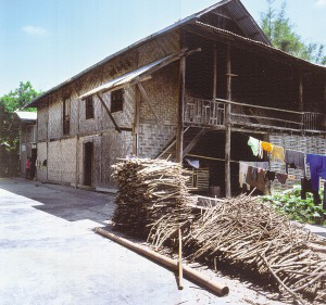 云南瑞麗的傣族民居。瑞麗的傣族民居是二層的竹樓,竹編外墻是利用竹皮正反面的紋理和光滑粗糙面編織的,從檐下垂直到底,均勻的縫隙透光通風(fēng),在強(qiáng)光照射下,其多變的幾何圖案更突出了工藝技巧和干欄式建筑的整體美感。屋面脊長,出檐短,大都用鍍鋅瓦楞鐵板替代草頂。樓層四壁以竹篾板封閉,開尺許小窗。外附短柱作下層重檐的斜撐,四周再加一圈矮柱,與墻面斜撐配。
