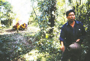進(jìn)入墓葬地,茂盛的野草,蔽日的樹林,不時進(jìn)入眼簾的墳堆,還有一伸一縮往人腳上爬的螞蟥,讓人毛骨悚然。來到一塊剛砍過的開闊地,中央挖了一個坑,里面滿是倒插著的樹柴,柴堆上還放著兩個舊汽車輪胎。巖化告訴我說:“一次火葬需要兩拖拉機(jī)柴,如果死者家里沒有柴,我們就會每家湊一兩根,直到湊夠?yàn)橹埂S密囕喬ナ菫榱烁玫娜紵??!比藗儼压撞耐7旁诓穸训淖髠?cè),將“恒叫”取下,巖約將棺材蓋板掀開,用從家里帶來的一個竹筒里的水朝死者臉上倒。巖約告訴我:“這是給死者洗臉,幫她打扮一下?!比缓?,大佛爺開始念經(jīng),經(jīng)文的大意是:“山上的神啊,我們的親人到這里居住,你們要好好服侍她,把周圍看管好!邪惡的鬼啊,這里是我們親人應(yīng)有的地盤,你們不得侵犯,你們不要來擾亂!”念完,就一個人先走了。然后,人們雙手合掌,掌中緊握一根蠟條,圍著轉(zhuǎn)了三圈,婦女們也先走了。邊走還邊相互告誡,不要回頭看,不然死人的鬼魂會跟著你走。剩下的男人將棺材抬上柴堆,將用白布裹著的死者,頭朝寨子,腳朝外,意思是你已從寨子出來了,以后再也不準(zhǔn)回寨子了。用柴壓著,又把棺材砸碎,將棺材碎片也堆放上去,有人就拿來一個塑料桶,開始往上潑澆柴油,并從寨子的這方先點(diǎn)火。一會兒,熊熊的大火便燃燒起來。有人拿著用礦泉水瓶子裝著的酒給大家倒,輪流喝。喝過一圈后,他們摘下一枝樹枝,往自己的衣襟前后拍打一陣,將樹枝扔進(jìn)火里。巖化說:我們要走了,這樣做是把身上的鬼氣趕盡。我也敢緊學(xué)著他們的樣子做了一通,便隨人們離去。