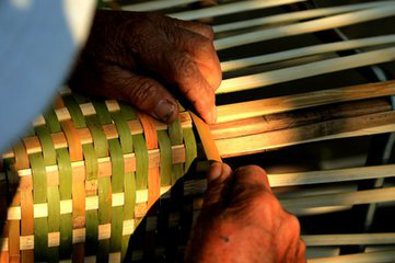 傣族竹編工藝是傣族的傳統(tǒng)工藝美術形式,歷史悠久,造型古樸,美觀實用。由于我國傣族主要聚居在云南等地的熱帶、亞熱帶地區(qū),居住地周圍多與竹子為伴,在生產(chǎn)生活中就地取材,形成了傣族世代相傳的主編技藝,具有著鮮明的民族特色。傣族竹編選材主要采用藤竹、粘竹、大黃竹以及巨龍竹等編織,將竹絲、篾片挑壓交織,被挑壓的篾為“經(jīng)”,編織的篾為“緯”,由經(jīng)與緯的挑壓可以編織出千變萬化的圖案,從而制作出千姿百態(tài)的竹編產(chǎn)品。代價的村村寨寨都掩映在竹林翠色之中,住的是竹樓,用的是各式自編的竹器,大至床、桌、柜、席,小至帽、盒、籃、簍,無一不為竹編。精美的竹編不僅是傣族人民的日常用品和生產(chǎn)工具,更是傣族人民生活藝術的外在表現(xiàn),它已與傣族人民融為一體,已經(jīng)成為傣族最重要的民族文化載體和文化傳播的媒介。