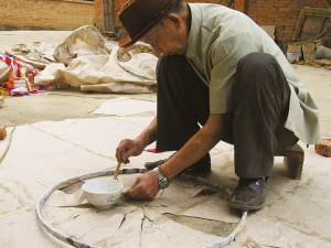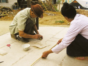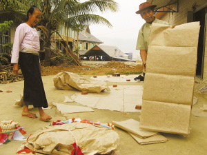 言談間,巖妞把制好的竹環(huán)放入早已畫(huà)好的同心圓圖案中的小圓上,只見(jiàn)竹環(huán)大小正好與小圓吻合。巖妞說(shuō),圖案外側(cè)的大圓便是擺放棉紙用的。接著,他把手中厚厚的幾張棉紙圍繞著已經(jīng)放入圖案中的竹環(huán)依次擺入,直至擺滿。在同心圓圖案的上側(cè),巖妞還畫(huà)了一個(gè)寬與同心圓圖案的直徑相符的矩形圖案,把棉紙鋪滿其中。巖妞說(shuō),這圖形就是“貢菲”的高度。制作的最后一道程序,是把棉紙用漿糊粘合起來(lái)。陰干后,一個(gè)“貢菲”就做好了。