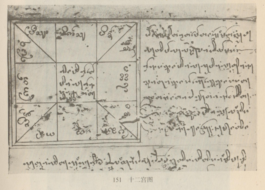 傣哪文天文著作中保存的傣繃文黃道十二宮圖。圖分13格,周圍12格寫傣繃文十二宮名,以上中格為起點(diǎn),往左其順序為白羊?qū)m、金牛宮、雙子宮、巨蟹宮、獅子宮、室女宮、天秤宮、天蝎宮,人馬宮、摩羯宮,至雙魚宮與白羊?qū)m銜接。中格及圖外說明皆傣哪文。為罕見的兩種傣文合壁的天文學(xué)資料。原件存民族文化宮。