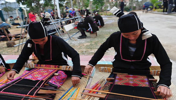 紡織也是黎族地區(qū)副業(yè)生產(chǎn)之一,紡織原料的來源,主要靠野生植物纖維,如木棉和各種野麻等,其次是以漢區(qū)或者向漢商買來的色線和色布,將其拆線使用。婦女們一般都能紡織男子上衣、吊儋和女子上衣、筒裙、胸掛、頭巾以及麻被等。筒裙和頭巾一般紡織精美,色澤巡禮、花紋精美。筒裙上的花紋,多為動物紋或者植物紋,也有少數(shù)人物紋或用具花紋。由于紡織品多產(chǎn)于民間,沒有專門的機(jī)構(gòu)和組織,所紡織的成品,都是在不脫離農(nóng)業(yè)生產(chǎn)勞動的條件下單獨(dú)進(jìn)行的,所以效率很低。據(jù)調(diào)查,織一塊吊儋需要十天,一塊頭巾十天,一件無袖男子上衣四十天,一條麻被一年(長近四米,寬二點(diǎn)四米),紡織品一般均為自用,極少出售或者交換。