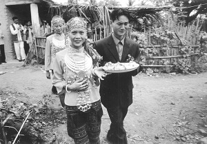 上午10點,新娘要“回返”娘家。伴娘挑著兩只籮筐,一邊放有糯米和豬肉,另一邊放著一件衣服。這件衣服只能是黑色或藍色,不能是花色和白色。據(jù)說花衣服新娘穿了會花心,白色則不吉利。這件衣服是婆婆特地送給新娘的,今后一定要穿。新娘和伴娘一起走在回返的路上,新娘舍不得離開婆家,走到村口,就把糯米飯和豬肉分給過路人吃,以示新娘的熱情好客。我也吃了籮筐里的糯米飯和豬肉,覺得很香,很好吃。之后,新娘和伴娘不再往娘家走,而是返回了婆家。