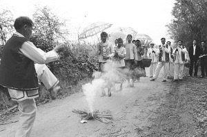 第二天一早,八音隊在前面邊走邊吹長調(diào)曲,由8人組成的迎親隊伍一路歡歌笑語地來到新娘家村口。八音隊要猛吹迎親曲,新娘家的人才出來迎接。這時,村里的一位長者拿著一把稻草、少許米飯、一個雞蛋,從村子走出來并緩緩點燃稻草,一邊念咒語,一邊向火堆拋雞蛋。然后,迎親隊伍走過火堆才能進村。