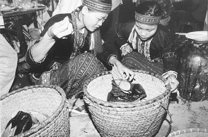 按照黎家人的規(guī)矩,“提親”是由男方家人請族內(nèi)的一位親嫂嫂當媒人,帶著檳榔、簍葉、煙絲到女方家。如女方本人及家人樂意接受禮品,說明親事已定下來了。