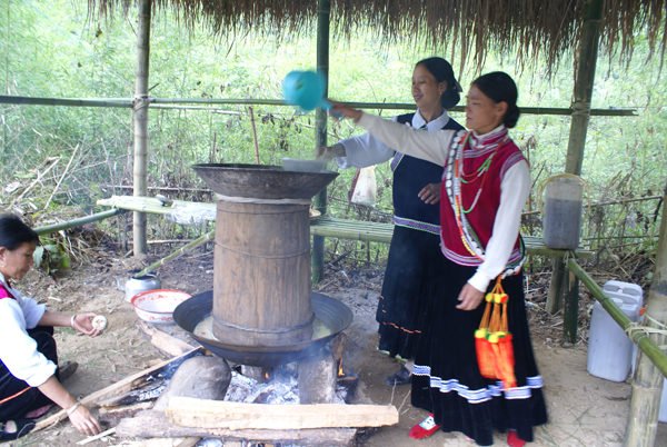 傈僳族一般居住在高山峽谷地帶。新中國成立前,生產(chǎn)力水平低下,人們往往早出晚歸,途中常常忍饑挨餓,而帶食物之類又不方便,于是,他們在長期的生產(chǎn)勞動過程中知道吃干飯比稀飯耐饑,這樣,就形成了傈僳族以“干”為主的飲食習(xí)慣:如蒸玉米面,由于傈僳族人耕種的土地大都離村寨比較遠(yuǎn),需爬坡走箐,體力消耗大,勞動歸來人們極想喝上幾口“飯湯”解渴、止餓,這樣,又形成了傈僳族以玉米稀飯為主的各種“稀”食輔之于“干”食的飲食習(xí)慣。新中國成立前,大部分傈僳族地區(qū)地多田少,主要糧食作物為玉米、旱谷、小麥、蕎麥、高粱等,這樣,傈僳族以玉米為主食,輔之以小麥、旱谷、蕎麥、大米等。副食有肉禽蛋類,但較少,主要還是上山獵取動物輔之。蔬菜、水果種類也不多。