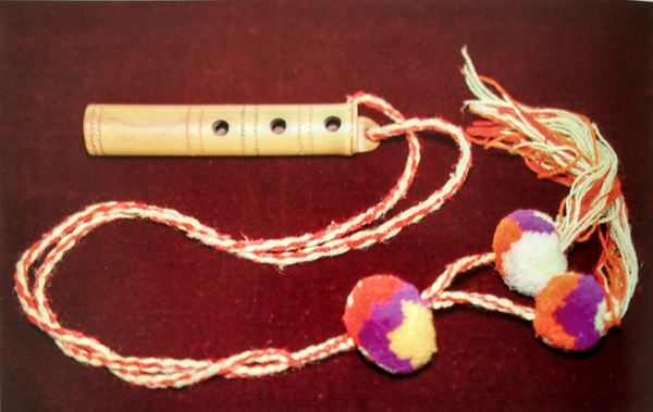 直笛,傈僳語稱之為“迪哩吐”(如圖),多用蘆葦制作,長(zhǎng)約5寸,有4個(gè)圓孔,3孔在正面,1孔在背面,音量較小,音色柔和動(dòng)聽,為青年男女抒情和求愛必要的工具。