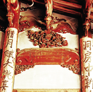 畬族的古老民居都是深宅大院,堂屋高大、寬敞,也是裝飾的重點(diǎn),神龕、窗欞都有鏤空木雕和浮雕裝飾。堂屋依木柱用木板隔間,板壁上露出半圓的木柱,在對(duì)應(yīng)的木柱上貼著紅紙濃墨的對(duì)聯(lián)——每逢新婚、祝壽、春節(jié)等重大節(jié)慶都要貼對(duì)聯(lián)。