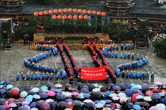圖為(雷山達(dá)地水族鄉(xiāng))雨中表演水書 (原載中國網(wǎng)·中國民族) 引自民族畫報(bào)