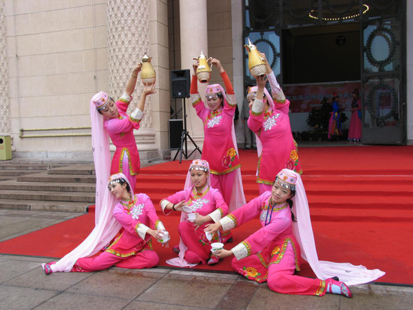 宴席曲:流行在中國西北地區(qū)回族、東鄉(xiāng)族、撒拉族、保安族的傳統(tǒng)習俗性舞蹈。是迎親時男方宴請女方送親者的宴席間演唱的歌舞形式。曲調(diào)優(yōu)美,節(jié)奏性強;歌詞多敘述民間故事、傳說和一些幽默逗趣的內(nèi)容。舞蹈動作不配合歌詞具體內(nèi)容,只表達歡樂的情緒。宴席曲多為2—8人的男子對舞,相互換位后,有屈膝半蹲、雙手伏膝的行禮姿態(tài)。其基本步法一般是腳尖或腳掌先落地、膝部屈伸,使身體如波浪起伏,與頭部的擺動、顫動相協(xié)調(diào)。手勢有單晃手、雙晃手、掏手、望月等,舞姿灑脫昂揚,表現(xiàn)了高原民族豪放、開朗和詼諧的性格。