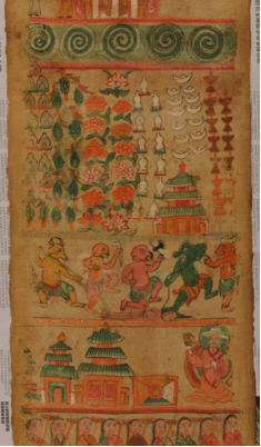 納西族東巴教的長(zhǎng)幅布卷畫(huà),通稱為“神路圖”,它是東巴教繪畫(huà)中的巨作。此類畫(huà)一般長(zhǎng)10-20米,寬1尺左右,有“古代宗教繪畫(huà)第一長(zhǎng)卷”之譽(yù)。文化內(nèi)涵異常豐富,在國(guó)際學(xué)術(shù)界被視為宗教繪畫(huà)一絕。如今,此畫(huà)已成稀有之物。很少見(jiàn)到尚留存民間的神路圖了?!吧衤贰敝鉃闁|巴為死者評(píng)斷、指點(diǎn)通往神地之路,把他們從地獄的煎熬中解脫超度出來(lái),轉(zhuǎn)生為人,送至神靈之地。在納西族的喪葬和超度亡靈儀式上,根據(jù)神路圖導(dǎo)引死者靈魂進(jìn)入新的生命場(chǎng)是一件極為重要的大事。到時(shí),要把神路圖展開(kāi),眾東巴站于圖旁依次詠誦8冊(cè)《神路圖經(jīng)》,為死者評(píng)斷路徑,導(dǎo)引亡靈穿越鬼地;擺脫惡鬼的種種折磨。在納西族實(shí)行傳統(tǒng)安葬習(xí)俗時(shí),要在安葬場(chǎng)鋪開(kāi)神路圖,把圖上的鬼地部分朝著死者頭部,向東北方向鋪開(kāi)。往東北方向鋪的意思是死者靈魂將回歸東北方向的納西遠(yuǎn)祖之地。把死者靈魂送到“祖先之地”是納西族的古代民俗。各地納西族都有十分詳細(xì)的送魂路線,靈魂返祖地必經(jīng)的每一個(gè)地名都在口傳和寫于東巴經(jīng)的送魂路線中標(biāo)出。其畫(huà)面所繪鬼神人三界有數(shù)百個(gè)人神鬼獸的形象和很多具有宗教象征意義的物象,有佛像、神像、各種動(dòng)物神,七八十個(gè)奇禽異獸以及東巴跳神的舞蹈布局,畫(huà)卷內(nèi)容以靈魂不滅,因果報(bào)應(yīng),生死輪回等佛教信條為指導(dǎo),用連續(xù)性和富有戲劇性的畫(huà)面表現(xiàn)人死后亡魂不滅。
