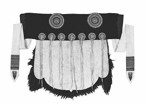 剪裁時(shí),將羊皮修剪成U型,上部橫鑲一段黑氆氌(毛織品)或黑呢子,內(nèi)襯天藍(lán)色棉布。其下用七對(duì)白色鹿皮條穗縫綴并列的七個(gè)小圓形彩線繡花布盤,肩部縫綴兩個(gè)大圓形彩線繡花布盤。羊皮上端縫釘兩條繡花白布長(zhǎng)帶,帶端還繡有花鳥、魚蟲、動(dòng)物、植物、幾何等圖案,據(jù)說(shuō)是象征納西族人民如蜂似蝶地奔忙,以辛勤勞動(dòng)換取甜蜜生活。