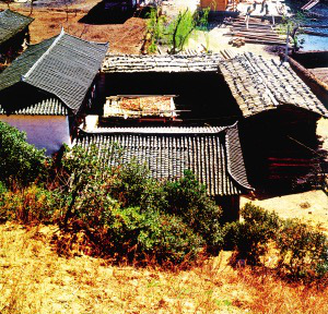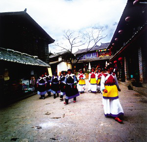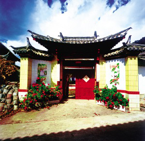 束河、沙河古村鎮(zhèn)到處都是納西族的田園式庭院。大門的裝飾與圍墻和屋脊的裝飾相呼應,庭院里種了許多植物,高的果樹,矮的花草,就像一個小花園,和田間彌漫著的野薔薇都散發(fā)著令人陶醉的幽香。