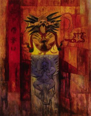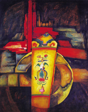 我以前所結識的一批納西族畫家差不多都是上世紀四五十年代出生的,他們大多接受過美院等高等藝術院校的教育,具有堅實的繪畫功力,有相同的美學見解和共同的探索形成的藝術追求。它一出現就以其獨特的美學傾向和特殊的藝術魅力引起世人的關注。而和向東是上世紀70年代出生的青年畫家,他原來就讀于浙江大學的藝術設計專業(yè),只因迷上美術學理論而走上了創(chuàng)作之路,沒有學院派的背景。他的家鄉(xiāng)云南麗江現在已是聲名鵲起,納西族東巴文化作為世界記憶遺產已聞名海內外。作為年輕一代的納西族畫家又該怎么表現東巴文化呢?這個學藝術設計的年輕人以設計師的獨特眼光和思維,一開始就與“現代東巴繪畫派”的中年畫家群體拉開了距離。其作品在保留古老的東巴繪畫藝術的基礎上,在作品中運用書寫東巴經卷的各種形象和文字符號。用當代人的思維觀念和審美意識,運用油畫的技法來表達。畫面大多用平面設計的構成原理,以裝飾性的、形式感極強的、既寫實又抽象的手法表現出原汁原味的納西文化。即使拋開作品主題內涵,依然可以從他的作品里感受到一種神秘、古樸、深沉的歷史基調。因4年前他的創(chuàng)作是在平面設計為主的業(yè)余時間里完成的,而真正投入精力進行專業(yè)創(chuàng)作是近兩年的事,因此,他現在處于學習、吸收、探索創(chuàng)作的過程中。