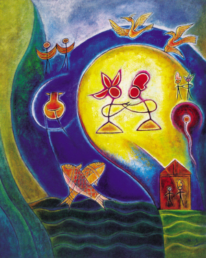 作品以東巴象形文字“男女相擁”符號為主,還以“雙魚、心、男女起舞、家”等與愛情相符號組成畫面