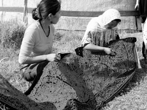 秋來(lái)春往,花落花開,瑪利亞從小女孩長(zhǎng)成大姑娘,她的繡藝也日漸嫻熟,結(jié)繡、鉤繡、扎繡、刺繡、串珠片繡、格子架繡、十字繡……在日復(fù)一日的飛針走線中,她練就了一雙巧手和溫柔內(nèi)斂的性格?,斃麃喞C花,先勾勒花朵的輪廓,再用細(xì)的色線填滿輪廓內(nèi)的空間,由外向內(nèi),一圈一圈、一層一層,直到色彩飽滿的圖案凸現(xiàn)出來(lái)。草原上黃色的野菊、白色的蒲公英、藍(lán)色的薰衣草、紅色的刺玫,都像被擷取了精靈似的,綻放在柯爾克孜女人的繡品中,流露出她們與自然界溫暖而平和的情感交流。