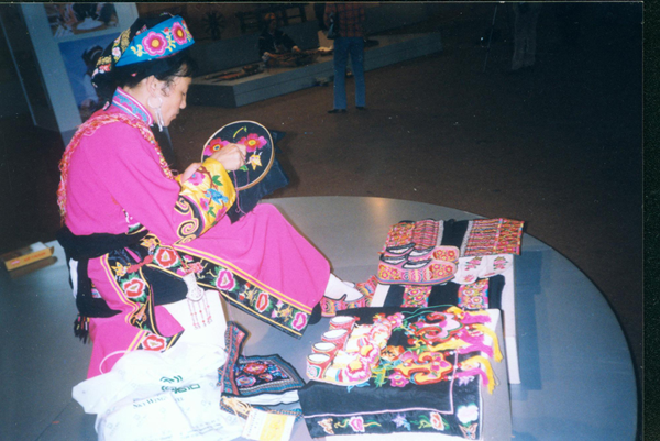 羌族傳統(tǒng)的民間工藝美術(shù)以挑花、刺繡最為出色。羌族姑娘從小就學(xué)習(xí)針線(xiàn)活,成年后都是女紅好手。刺繡時(shí),無(wú)需草圖或畫(huà)線(xiàn),心靈手巧的羌族婦女信手能刺繡成絢麗多彩的成品。挑繡時(shí),以布的橫豎方格線(xiàn)為基準(zhǔn),采用挑、纖、扎、繡、勾、納、提、拼、扣等技法,單用或幾種并用,挑繡出來(lái)的幾乎都是栩栩如生的植物花卉、波浪等圖案。挑繡常用了頭帕、衣、褲、腰帶、鞋等易磨損處,既美觀又實(shí)用。一般煙荷包會(huì)繡兩種圖案,鴛鴦戲水和比翼雙飛,意在祈求男女雙方恩愛(ài)和諧。