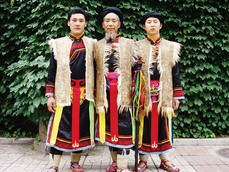 圖片左為楊俊清,中為老釋比朱金龍(楊俊清的老師),右為余正國(原是一名當地的羌語老師)。他們是當地有名的釋比。    梁黎2008年攝于北京