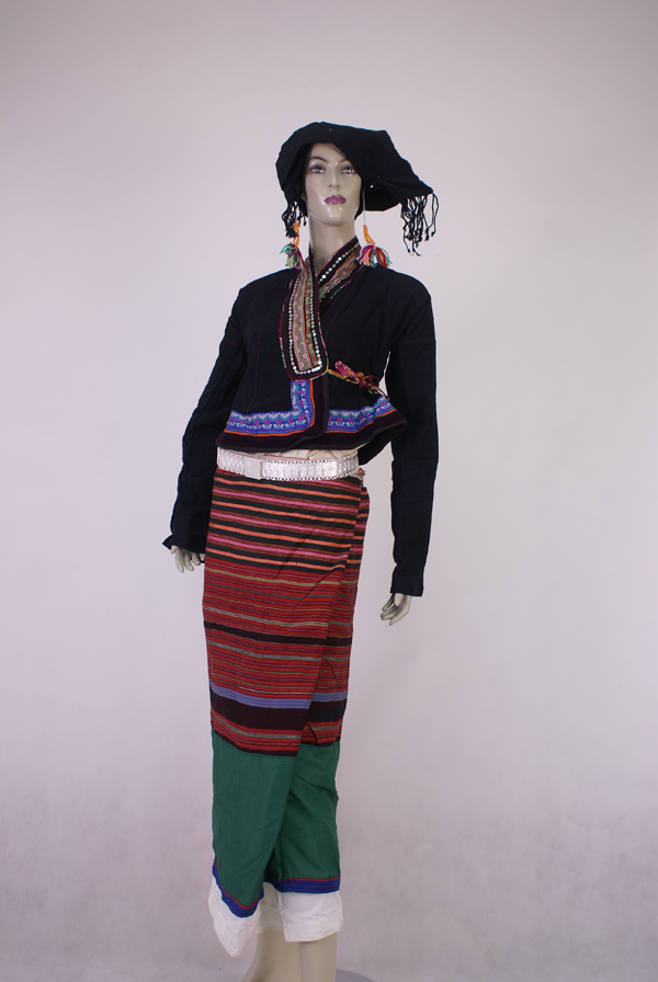 婦女的衣裙與傣族相似,上穿緊身短衣,頭頂挽髻,用頭巾纏頭,喜歡戴大耳環(huán)、銀手鐲等裝飾。姑娘愛戴野花或自編的彩花,將雙頰染紅。一般,女子上著左右兩祚斜襟窄袖黑色小褂,小褂為圓領、緊腰、寬擺,短及臀部,在左肋下拴線打結(jié),已婚婦女用黑色布料,未婚姑娘喜淺藍色或白色。里衫為無袖貼身夾衫,下穿兩條筒裙,內(nèi)裙為白色,外裙有兩色,臀部以上為紅色橫條,腿下為綠色或黑色,用布條或花邊鑲飾。未婚婦女用黑或藍布包頭;已婚婦女梳發(fā)髻,插銀簪,頂端鑲3顆棱形玻璃珠,下系銀鏈,纏包頭。婦女戴銀耳環(huán)、項圈、手鐲等飾品。