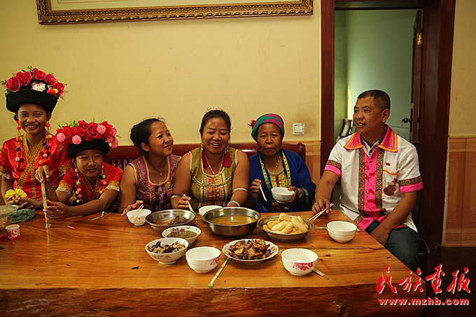 在曼夕村,民族傳統(tǒng)節(jié)日已成為不同民族間聯(lián)絡增進感情的最佳時機。曼夕村村主任車達告訴記者,他自己是哈尼族,村里還有漢、布朗、哈尼等民族。40多年前,為了種植橡膠樹布朗族與彝族遷徙過來生活在一起,幾十年來,兩個民族相互尊重對方的生活習慣,過年過節(jié)相互走動拜訪,互相通婚成為一家人。晚飯時,記者在曼夕村村支書巖坎硝家里聚餐時看到車達帶著幾個哈尼族婦女盛裝出席,宴會上人們相互祝賀,唱敬酒歌。哈尼族婦女圖處告訴記者,哈尼族過傳統(tǒng)節(jié)日,布朗族村民要來慶賀,布朗族過節(jié),哈尼族人也去祝福,幾十年來一直如此。
