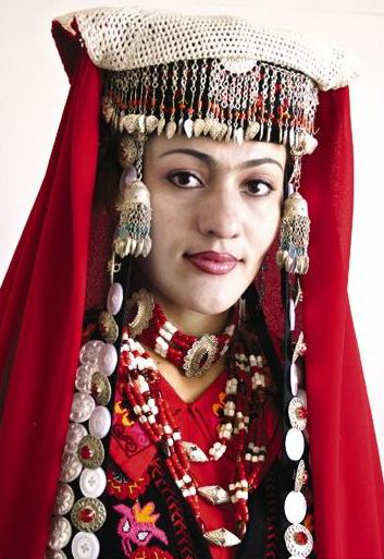 塔吉克族女子愛戴首飾,最引人注目的要數(shù)新郎和新娘的裝束了。新娘的“庫勒塔”帽,前綴一排銀色小鏈子,戴長(zhǎng)長(zhǎng)的耳環(huán),頸部戴幾排碩大的項(xiàng)鏈。辮子上飾流蘇或白扣、銀元,手有手鐲、戒指。新娘頭上是一條長(zhǎng)長(zhǎng)的紅色或黃色頭巾,外穿紅色長(zhǎng)大衣,系紅白相間的手帕。