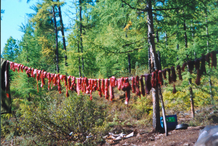 鄂溫克族人的飲食根據(jù)居住地的自然環(huán)境有所不同。林區(qū)的鄂溫克族完全以肉類作為日常生活的主食,主食包括罕達犴肉、鹿肉、熊肉、野豬肉、狍子肉、灰鼠肉,飛龍、野雞、烏雞、魚類等,其中鹿、狍子的肝、腎一般都生食,其他部分則要煮食。牧區(qū)的鄂溫克族以乳類和乳制品為主食,其中比較特別的食物是奶茶。