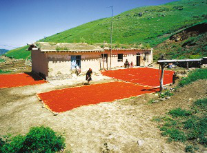 土房的室內(nèi)除有的搭火炕外,其它的裝飾和木房的一樣。到了采收紅花的季節(jié),鮮紅欲滴的紅花曬滿了院子,形成獨特的風(fēng)景。不論哪個房間,都可作為臥室,也用于待客,廚房和儲藏室單建,有的還單建馕坑。