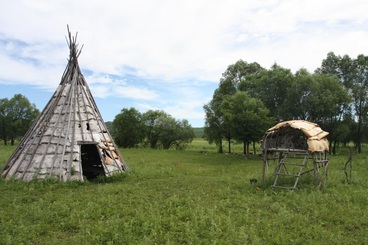 游獵時(shí)期居無(wú)定所,所以鄂倫春人居住的房屋是便攜式的“斜仁柱”?!靶比手睘槎鮽惔赫Z(yǔ),意為木桿房屋。所謂木桿房屋,是就其骨架而言,因其骨架是用木桿撮立而成,所以又叫“撮羅子”。幾根帶衩的木桿相互咬合撮立于地面,傾斜七八十度,再將二十幾根木桿撮搭在周?chē)?,呈圓錐形,這就是“斜仁柱”的骨架,不釘釘,不系繩,只在頂端套一個(gè)“烏魯包藤”(柳條圈),即牢又穩(wěn)。骨架上的覆蓋物冬夏有別,冬季的覆蓋物用狍皮制成,鄂倫春語(yǔ)叫“額爾敦”,夏天的覆蓋物用白樺樹(shù)皮制成,鄂倫春語(yǔ)叫“鐵克沙”。近代以后,夏天開(kāi)始用白布圍蓋“斜仁柱”。搬遷時(shí)只將覆蓋物卷起來(lái)放在馬背上馱走,骨架留原地不動(dòng)。
