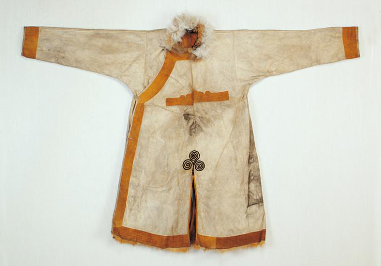 鄂倫春族的傳統(tǒng)服裝以袍式為主,冬季穿“蘇恩”?!疤K恩”是用冬季絨毛狍皮縫制的右任長(zhǎng)袍,小立領(lǐng),襟邊、下擺和袖口用黑色皮鑲嵌云卷花紋等邊飾,女袍還要作環(huán)肩裝飾。為便于奔跑和騎馬,“蘇恩”都有開衩,衩口裝飾圖案豐富多彩。夏天穿用夏季沙毛狍皮制作的短袍或坎肩,布匹傳入以后穿布袍。 男子下身穿狍皮短褲,褲腿過膝,樣式如老式免襠褲,后來改穿長(zhǎng)褲。出獵時(shí)褲子上面還要穿套褲。套褲無襠,呈筒狀,上角釘有皮條,系在腰帶上。一般用夏季的狍皮縫制,因?yàn)橄募镜尼笃ぐ搴衲湍ィ灿杏寐蛊たp制的。婦女的褲子樣式比較獨(dú)特,長(zhǎng)至腳面,比男褲瘦些,腰兩側(cè)有開衩,前面有兜肚,兜肚頂端釘皮條,系在脖子上。這樣的褲子,既保暖又便于騎馬,可以護(hù)住前心,又起到了乳罩的作用。講究的人還在褲子兩側(cè)和褲腳處繡上花邊圖案。