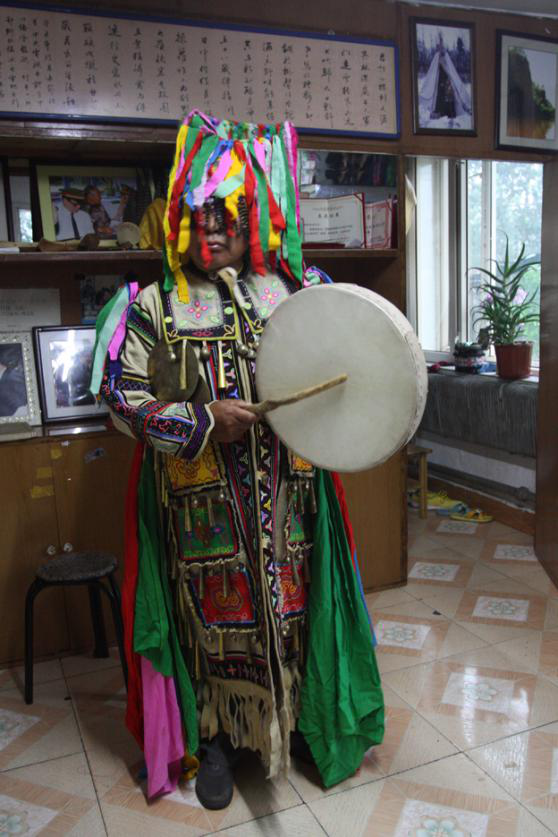 冬天穿的鞋是“奇哈密”和“溫得”,“奇哈密”是用狍脖皮或犴皮做靴底,用狍腿皮拼縫成靿的短靴?!皽氐谩笔怯寐够蜥砥ぷ龅祝够蜥硗绕て纯p成靿的長(zhǎng)靴?!皽氐谩币?yàn)殪壐?,冬天穿著打獵不易灌雪。這兩種靴子都要用冬季絨毛狍皮做成的襪子配套穿用,暖和跟腳,踩在雪地上沒有聲響。夏天一般穿“奧勞其”,是一種皮底布靿短靴。“考呼落”,是用冬季絨毛狍皮縫制的二指手套,掌面腕部留一縫口,手從縫口中伸出,手套仍護(hù)在手背上,既使在零下40度的嚴(yán)寒中處理獵物,也不用擔(dān)心手被凍壞。還有一種五指狍皮手套,背面正中繡花、蝶等中心圖案,五指的關(guān)節(jié)和指甲處繡出各種小型圖案,然后用連理枝將中心圖案和關(guān)節(jié)、指甲圖案連為一體,中心圖案代表手掌,手指圖案代表關(guān)節(jié)和指甲,連理枝代表骨骼和血脈(圖為越來越鮮見的薩滿服飾,吳雅芝供圖)。