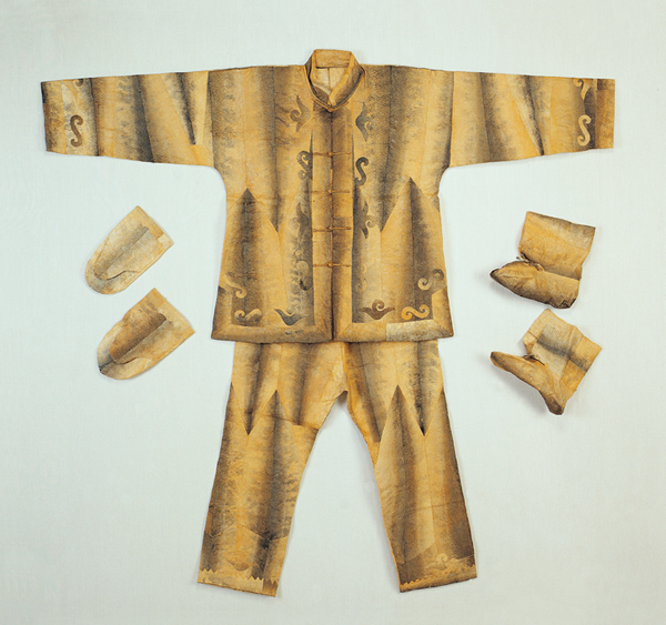 以魚皮為衣,是赫哲族傳統(tǒng)服飾習(xí)俗的一個(gè)顯著特點(diǎn)。各種各樣的魚皮,具有各自的用途。例如,懷頭魚皮可以做手套、褲子、套褲、鞋幫、綁腿,大的懷頭魚皮還可以做口袋;細(xì)鱗魚、哲羅魚、鰉魚、大馬哈魚等魚的魚皮,既可以做手套,又可以做靰鞡;鯉魚皮、趕頭魚皮可以做衣服和褲子;胖頭魚皮、狗魚皮可以做褲子和魚皮線。用魚皮做的衣服古樸美觀,結(jié)實(shí)耐用,主要有“烏提口”(女式魚皮上衣)、 “奧約刻” (男式魚皮套褲)、“嘎榮”(魚皮女套褲)等。