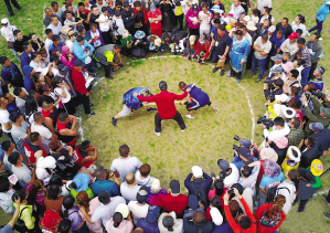 參賽隊(duì)員參加傳統(tǒng)體育項(xiàng)目頂杠比賽。 許叢軍攝