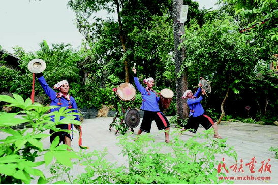 德昂族水鼓舞州級(jí)傳承人李三所(右)與村民們一起表演德昂族水鼓舞。