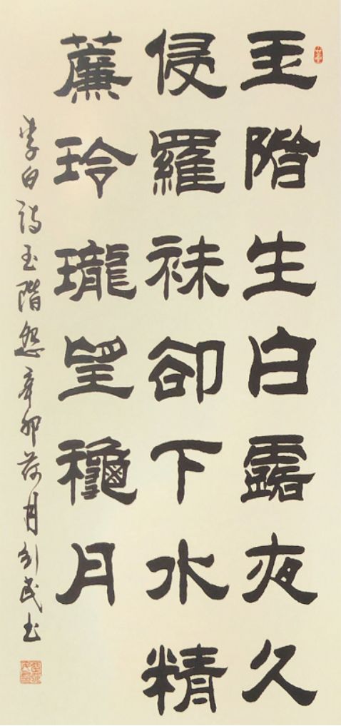 從書(shū)法觀念上說(shuō),張行民屬于“傳統(tǒng)派”。在傳統(tǒng)中國(guó)美學(xué)中,劉勰《文心雕龍》中所謂“剛健既實(shí),輝光乃新”是最為健康的生命情調(diào)體現(xiàn)。“魏晉風(fēng)度”的一個(gè)非常重要的審美標(biāo)志就是人的“骨氣”,無(wú)骨氣,則算不上風(fēng)度。中國(guó)藝術(shù)從它的凌空高蹈之際,就以骨為美,以氣為尚。書(shū)如其人,張行民書(shū)法頗顯其“骨”與“氣”,他的隸書(shū)胎息于歷代隸書(shū)大家的標(biāo)準(zhǔn)書(shū)風(fēng),取法與劉炳森先生的隸體風(fēng)格。為領(lǐng)會(huì)貫通隸體的本真,他讀帖臨帖如醉如癡,近來(lái)參以名家的大氣雍容,風(fēng)流表格,經(jīng)過(guò)一番整合已初顯“剛健既實(shí),真力彌滿”的個(gè)性風(fēng)采。從字法上講,他取諸家“簡(jiǎn)約”之長(zhǎng),以魏體的凌空取勢(shì)、大氣超拔以補(bǔ)其不足。從筆法上分析,他慣用高管長(zhǎng)鋒執(zhí)中守意,凌空高蹈,筆力遒逸,骨氣峻邁。讀他的字,可以感受到生命氣象的流落、情感意緒的噴發(fā),正是一種趨于壯美意向的審美生發(fā)。若再?gòu)狞c(diǎn)畫(huà)的線性質(zhì)感來(lái)看,張行民近作的最大特點(diǎn)是“遒勁厚重,剛健縱逸”。在創(chuàng)作中,情緒的激揚(yáng)往往左右了他對(duì)毛筆的掌控,在控制與時(shí)空中,他完成了筆與筆的連帶,線與線的綰結(jié),因此從整體作品看來(lái),渾然一氣,毫不掩飾其一瀉千里之概。