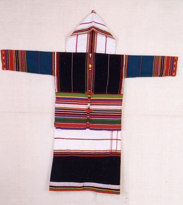基諾族婦女上衣為無領(lǐng)對開,上半部多采用黑布或白布,下半部及衣袖用紅、藍(lán)、黃、白等7色布配制或刺繡而成,用紅色鑲邊,上衣背部縫一塊約3寸見方的白布,上面繡有圓形太陽花式圖案(基諾族稱月亮花);內(nèi)衣為上部呈方形下呈菱形的兜肚式緊身衣,上部方形為鮮艷的條飾花紋,下部菱形繡著各式圖案。下身多著紅色鑲邊的黑色合縫短裙,并用一尺左右的黑布纏綁小腿。發(fā)型為椎髻,婚前髻在腦后右方,婚后髻在前額正中。頭戴披風(fēng)式尖帽,這種尖帽用長約60公分、寬23公分的豎線花紋土布對折,縫住其一邊而成,戴時又在帽沿上折起一指許的一道邊。