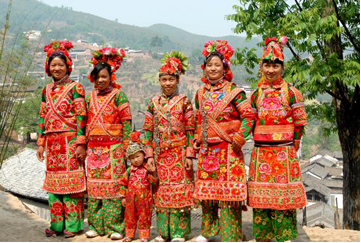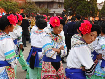 云南巍山彝族回族自治縣各民族如壯麗的織錦,將生活裝扮得五彩繽紛,充滿詩(shī)情畫(huà)意。其中特別是東山一帶的彝族服飾色彩較為豐富,款式變化多姿,并且以大量的銀制品和刺繡裝飾,制作工藝之精良,堪稱少數(shù)民族服飾一絕。以小孩帽而言,就有魚(yú)尾帽、小瓢帽、銀鼓帽、花帽和搭耳帽等數(shù)十種,名目繁多,式樣各異。帽子上都繡有花草、樹(shù)葉、龍鳳圖案,鑲嵌著閃亮的銀首飾,十分逗人喜愛(ài)。小孩的衣服式樣也很多,大多由紅、藍(lán)、綠、白幾種顏色的布料縫制而成,紅綠交織,藍(lán)白相襯,非常艷麗。如花朵一般的彝族少女通常頭戴銀鼓帽,墜耳環(huán)、身穿藍(lán)領(lǐng)褂,腰系花圍裙,下著綠彩褲,背掛圓裹背。銀鼓帽和繡花鞋做工極為精巧,全套裝飾花團(tuán)錦簇,恰似一只開(kāi)屏的孔雀。結(jié)婚后的婦女就不再戴帽子,改為結(jié)發(fā)髻,裹包頭。發(fā)髻一般呈寶塔狀,外裹黑紗和黑布包頭,發(fā)髻上戴“別子”?!皠e子”其實(shí)就是發(fā)卡,均為銀制品,分為四串,每串有兩個(gè)燈籠繡球,兩個(gè)響鈴和兩尾小魚(yú)。包頭巾外再用銀串珠、亮球飾之。上衣著右衽大襟,前短后長(zhǎng)、領(lǐng)、袖及襟邊則鑲以多層不同的金銀絲瓣或自繡花紋的多層寬窄不同的花邊。外罩齊腰藍(lán)布短領(lǐng)褂,領(lǐng)口上安裝著七個(gè)用銀鼓釘湊成五個(gè)葉子,狀如葵花形,彝語(yǔ)叫“披巴”的裝飾。領(lǐng)褂四周皆用銀鼓釘鑲邊,共四排,每排36顆。一件領(lǐng)褂上需有兩百多顆銀鼓釘,加上胸前佩戴銀制的“三須”針筒,“菱角吊”串珠和雞心型繡花荷包,整個(gè)裝飾真是銀裝素裹,分外嬌嬈。腰間系的圍腰布上,鑲嵌多層金銀絲瓣或自繡圖案的花邊。圖案有串枝蓮、牡丹花、太陽(yáng)花及鳳戲牡丹、丹鳳朝陽(yáng)等。無(wú)論未婚和已婚婦女,背上都有一個(gè)用羊毛搟制而成的圓型繡花裹背,直徑約一尺不等,內(nèi)外兩層,中可承物,上繡兩對(duì)太陽(yáng)花,一大一小,對(duì)稱排列。裹背除用作裝飾外,還可保護(hù)腰部,既有欣賞價(jià)值,又有實(shí)用價(jià)值,這在巍山彝族服飾中是最為典型的一件飾物。銀鼓帽繡有42朵小花,鑲有96顆銀鼓釘,帽頂插有花一朵或釘有櫻花一束。其帽形如金魚(yú),魚(yú)頭魚(yú)身為帽,魚(yú)尾多岔分為護(hù)頸,亦稱為“魚(yú)尾帽”。繡花鞋呈船形或鳳頭形,鞋面繡有40余朵小花,紅色中夾有40余片綠葉。如果是新娘鞋,則用紅色或粉色的軟鍛做鞋面,更為講究。