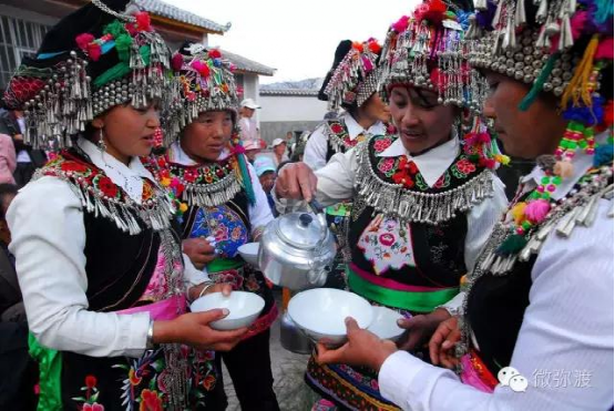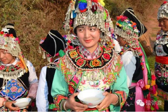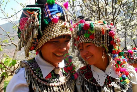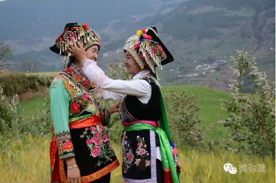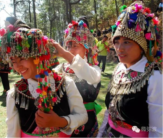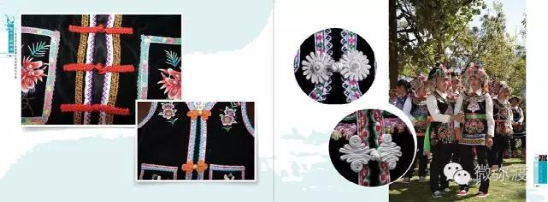 “羅羅潑支”男女服飾的特點(diǎn):“羅羅潑”男子服飾與“迷撒潑”相差無(wú)幾,一般不戴白頭巾。但是婦女的服飾相差卻很大,明顯保留著古樸高雅的南詔遺風(fēng)。頭飾由桂花、包頭、飄帶、大墜子、蜜蜂墜、芝麻鈴組成。桂花墊子在裱布上蒙黑色面料,中間訂有銀飾。包頭以黑色為主,長(zhǎng)約2米,后鏈系于包頭,鏈子為銀制。飄帶長(zhǎng)約4尺,黑色留花邊,兩頭訂英蘇。包頭還系有大墜子、蜜蜂墜各一對(duì),芝麻鈴20個(gè)。領(lǐng)合由裱布黑色面料上訂芝麻玲20個(gè)圍在脖子上。圍腰的前胸部,由領(lǐng)口至腹部,左右各垂掛一條綴有串珠、針筒、響篾(口弦)一類(lèi)飾品和生活用品的銀質(zhì)項(xiàng)鏈。人一走動(dòng),全身的小蘇鈴就響,聲音悅耳動(dòng)聽(tīng),形象美觀大方。額頭前還圍有一塊翠綠色的“桂花綁”,綁上釘有銀質(zhì)小泡泡200多顆,羅羅潑支婦女的服飾彰顯華麗之美。