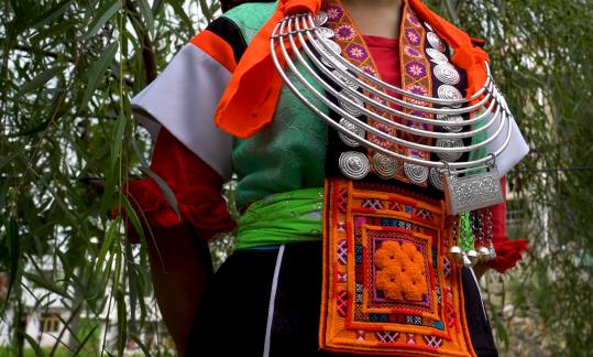 谷灑村女子服飾以短袖開衫服飾為主,短袖開衫服飾以綠色、橘黃色為主。谷灑村苗族背牌苗正是因為女子服飾上背牌而得名。在女子服飾,短袖開衫上必不可少的是背牌苗的背牌,背牌分為兩扇,后背牌較大,圖案以方形和字體為主。在前背牌系帶上同樣繡有圖案。背牌不僅是由刺繡圖案而成,還有銀飾。在背牌及系帶鑲嵌銀泡花。銀飾銀圈,銀圈的多少往往與女子家境有關(guān)。