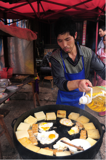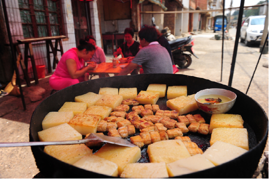 臭豆腐是平壩街的特產(chǎn),一直享譽滇東南。特別是在文山更是家喻戶曉。它火柴盒般大小,表皮長滿一層白白的絨毛。若是蒸吃,先揀幾塊鋪在碗底,再撒撮鹽巴,放點食油,加些姜絲,放進蒸鍋蒸熟。吃前用筷子攪和拌勻,看上去雪白,細嫩,宛若剛出籠的銀糕玉乳,散發(fā)出誘人的馨香。若用油煎,先將菜油舀進鍋里,待鍋熱時,立即放進臭豆腐。隨著“嗤”的一聲,香味立時撲鼻而來,再用小火耐心地將兩面煎黃,薄薄的黃皮內(nèi)含著一包乳漿。看了就讓人垂涎欲滴。