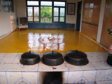 朝鮮族傳統(tǒng)民居建筑主要采用燒炕的采暖方式。一般有多大的屋子,就有多大的炕,這點與東北地區(qū)的漢族與滿族類似。一般在早上燒兩灶就可以維持一天,冬天非常溫暖,朝鮮族人們可以在炕上進行任何活動。