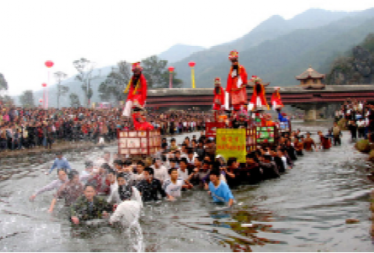 第二次是農(nóng)歷正月十五日上午,分上、下半闕。上半闕仍依十四日走法,至過午一時(shí)許,古事列隊(duì)從“方龍橋”下河床。鼓樂隊(duì)先互相潑水透濕,然后三響神銃,古事棚蜂擁下水,逆水而走。除天宮一棚不能超越外,后棚超前棚,則視為吉利。于是抬夫拼力而為,爭(zhēng)先恐后,不顧天寒水深、河石苔滑,跌倒了再爬起,情緒異常高昂,至下午三時(shí)許,一年一度的走古事才在高潮中落下帷幕。