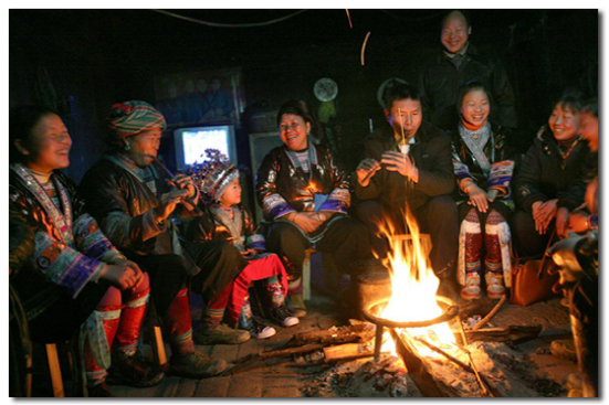 苗族起木樓很注重火塘的設(shè)置,特別留出二樓正中的大半廂作火塘。火塘用寬厚老杉木板鑲制成一個長寬約一點五米,深約六十公分的正方形木槽,槽內(nèi)用粘性強的黃泥巴填滿舂緊,正中央安放有三腳鐵架,用于架鍋煮食。火塘是煮食、進餐、取暖、會客、議事、祭祀的地方,又是年輕人走妹行歌、談情說愛、舉行婚禮儀式的場所。因此苗家人對火塘是十分看重的。