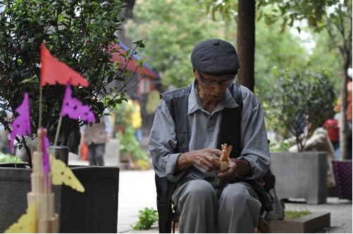 早上十點(diǎn)左右,火把就快扎好了。色彩鮮艷的紙裱斗升上各色卷著的彩旗正一個(gè)個(gè)被打開(kāi),梨、蘋(píng)果、花紅正被栓成一串串地掛在樹(shù)枝上,水泥桌上擺著小旗、炒蠶豆和糖果等,老人們?cè)谝慌赃呅吜?,一盤(pán)彩色米干在燦爛的笑著。