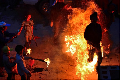 不到黃昏,鞭炮聲就響起來(lái)了。新生兒的父親點(diǎn)燃火把后,孩子們迫不及待地拿著小火把和松明粉,跑來(lái)跑去燒新生兒的的各種親戚,大人們樂(lè)呵呵地接受孩子們噴灑過(guò)來(lái)的火焰,并一致說(shuō)著很吉祥的祈愿祝福語(yǔ)。“從此晦氣不在嘍!”、“一年更比一年好呀!”、“紅紅火火又一年”。男女老少在火把樹(shù)下吃喝玩樂(lè),其樂(lè)融融。糖、炒蠶豆、梨、蘋(píng)果等被大家傳來(lái)傳去,新生父親挨個(gè)向親友敬酒。親友鄰居喝著喜酒,一致祝福新生兒安康成長(zhǎng),將來(lái)富貴吉祥。