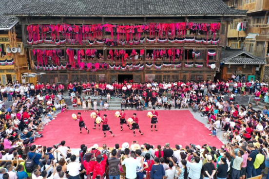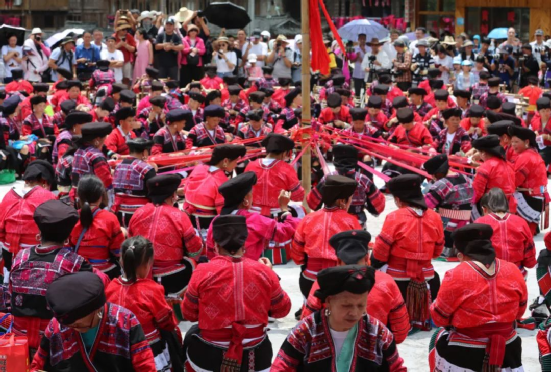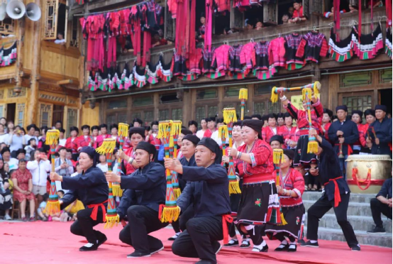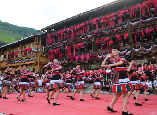 這一天,寨子里賓客盈門熱鬧異常,嫁出去的女兒和在外寨入贅的兒子都要挑著鴨子、酒和禮品,背著小孩回家吃團圓飯,家家戶戶包粽子過大節(jié)。紅瑤姑娘和嫂子們,紛紛推開窗戶,拿出民族盛裝一件件掛在窗外晾曬,整個寨子掛滿了紅衣服,顯得格外鮮艷奪目。
