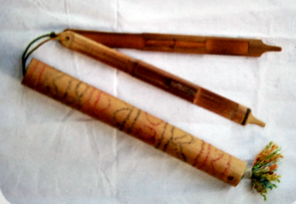 彝族特色樂(lè)器:補(bǔ)熱、阿烏和牛角小篳篥;右為彝族三弦