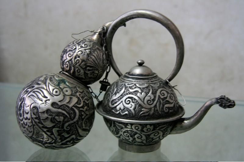 銀飾造型通常以龍、虎、牛、馬、鳥、昆蟲、花卉等動植物圖案為元素,經(jīng)過溶銀、錘片、拉絲、鑄模、做花、絞絲、編花、焊接、洗花等多道工序完成。成型的銀飾在最后一道工序中,需放入硼砂與火硝的混合液中浸泡,再高溫烘干并加熱至紅色,然后再放入明礬水中洗滌,去除污物和雜質,即可生成銀金屬特有的質感和光亮。劍河苗族銀飾工序繁復,技藝精湛,造型栩栩如生,成品精美絕倫。