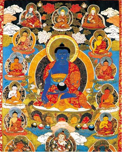 堆銹是青海塔爾寺獨創(chuàng)的一種藏族繪畫藝術(shù)形式,屬唐卡中的“國唐”。其制作特點是用各色質(zhì)地不同的綢緞綾羅剪出人物形狀和各種圖案形狀,然后在形象或圖案背后充塞羊毛、棉花等物,再逐一繡在黑色底子的大幅布幔上,使畫面產(chǎn)生出豐富而生動的立體感和織物特有的肌理感,具有淺浮雕式的藝術(shù)效果。